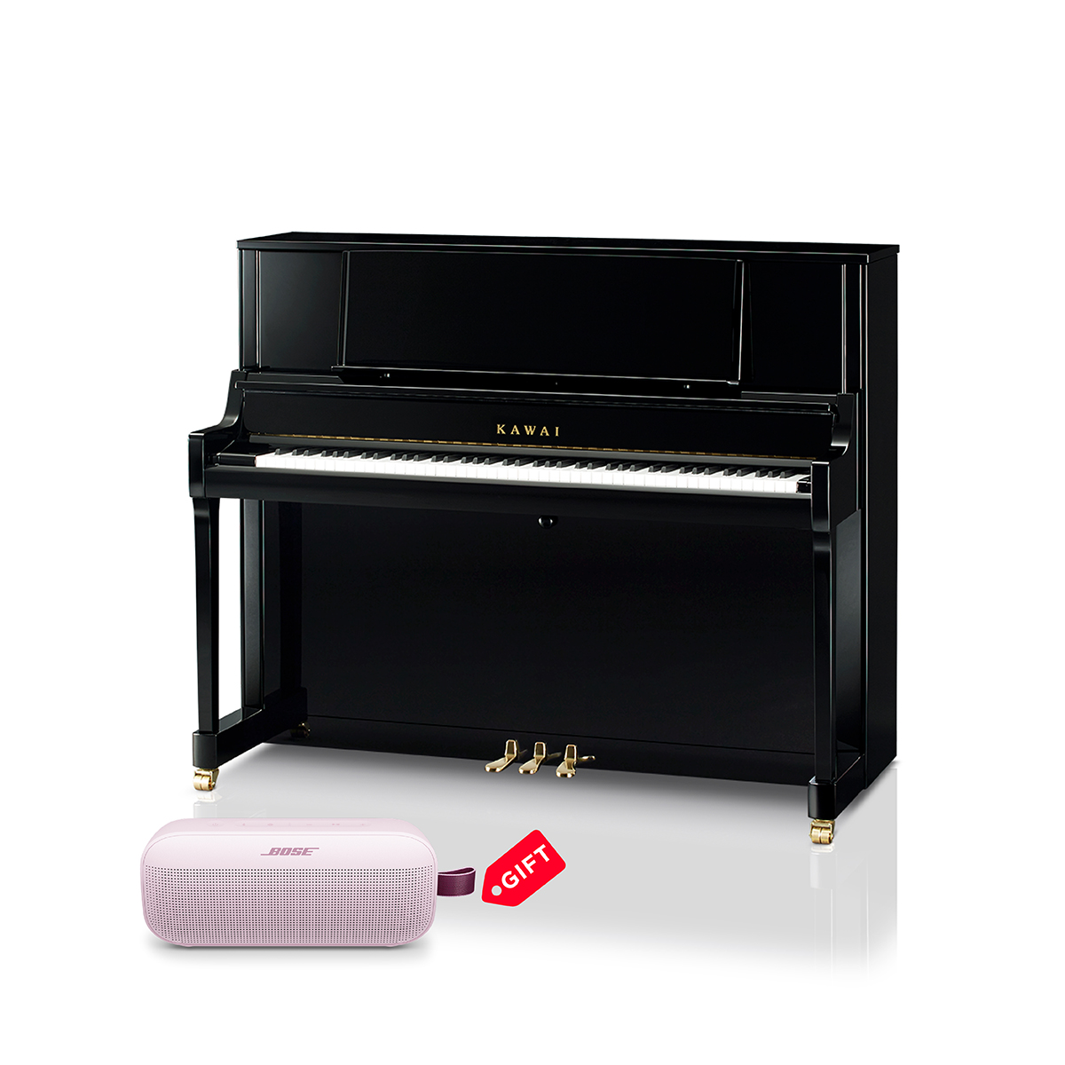 K-400 ที่มีดีไซน์อันเป็นเอกลักษณ์ มาพร้อมกรอบความสูงขนาด 122 ซม. มีที่วางโน๊ตสไตล์แกรนด์เปียโน ที่วางเพลงในระดับสายตา และมีความมั่นคงสำหรับโน้ตเพลง และหนังสือเพลงขนาดใหญ่ ฝาปิดคีย์เปียโนแบบบานพับคู่เพิ่มลักษณะที่โดดเด่นให้กับเปียโน